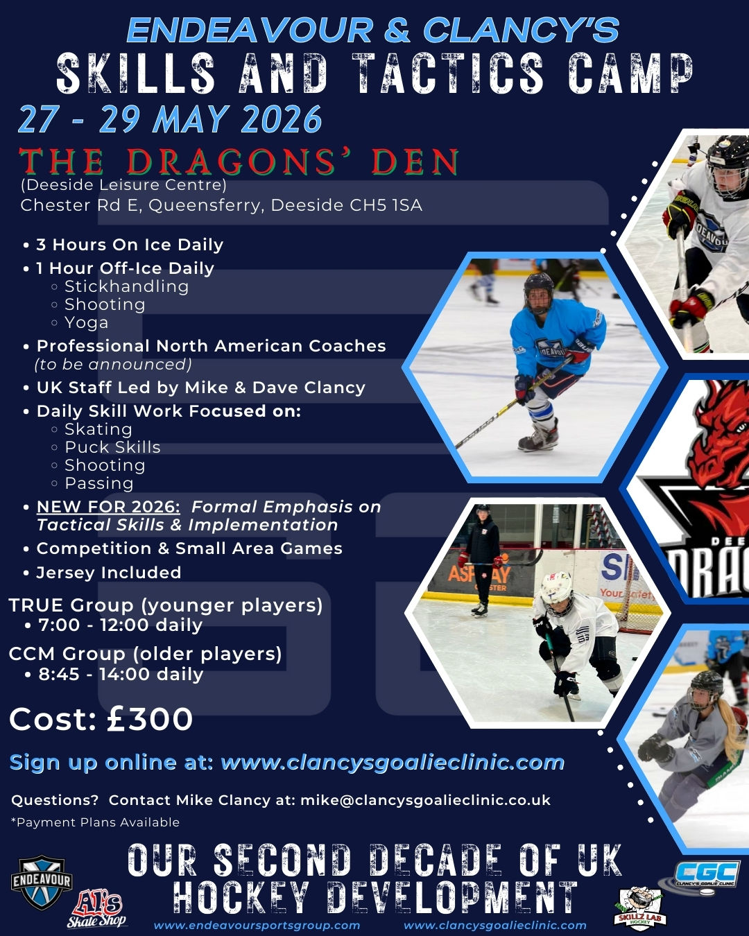 Ice Hockey session 06:30 - 08:00 running Monday morning every week. Sessions are Supported by the Deeside Dragons, Clancy's Goalie Clinic, Endeavour Sports Group, Colin Cromie, and Jake Witkowski